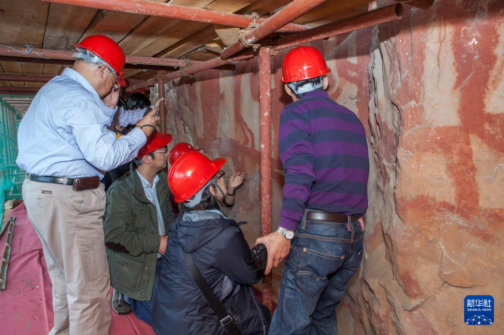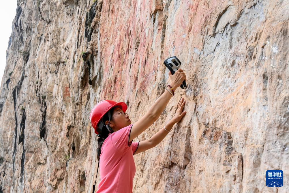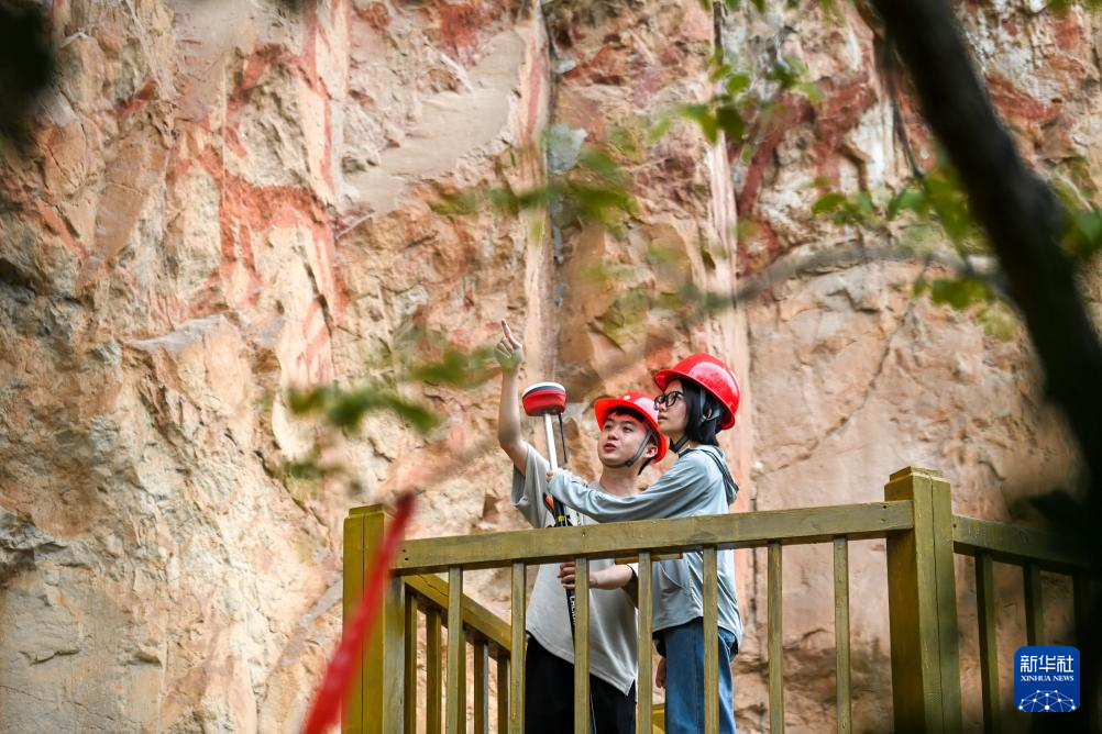 6月19日,在位于广西宁明县的一处花山岩画,工作人员对风化崩落的岩石进行检测。