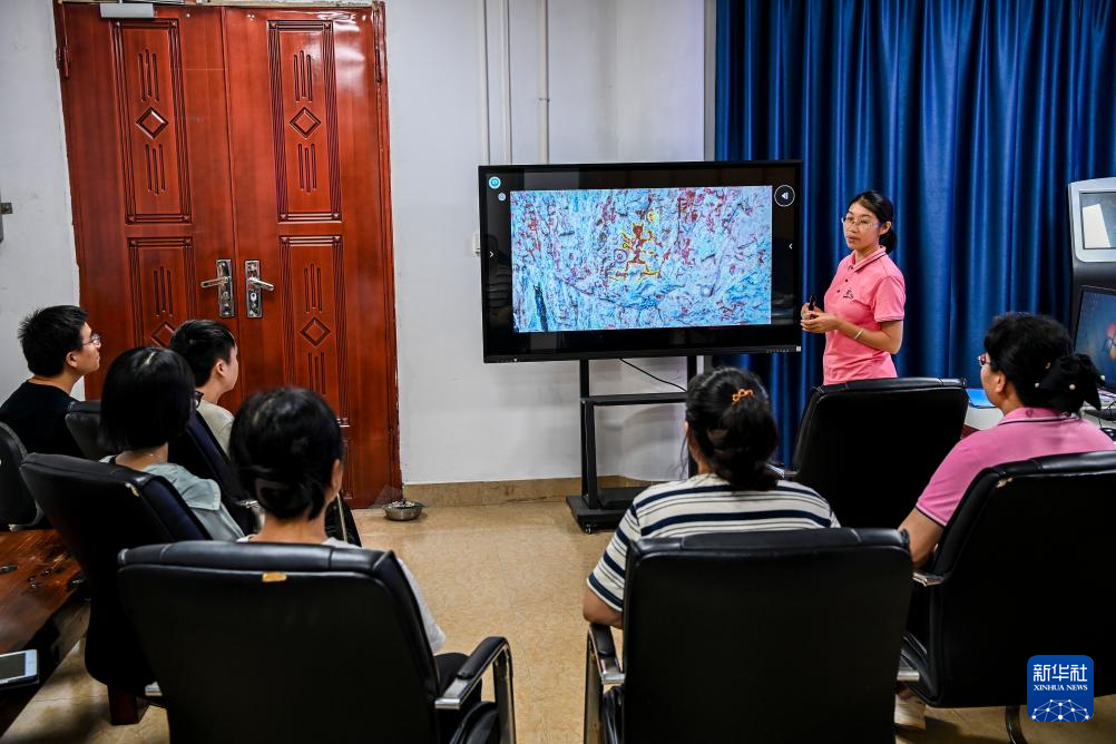 6月19日,在位于广西宁明县的花山岩画监测站,工作人员进行业务讨论。