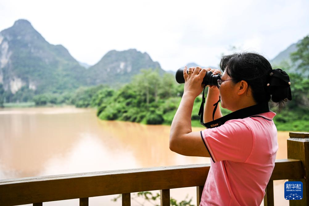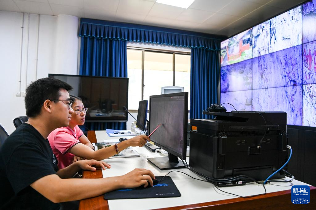 6月19日,在位于广西宁明县的花山岩画监测站,工作人员通过监控设备查看岩画情况。