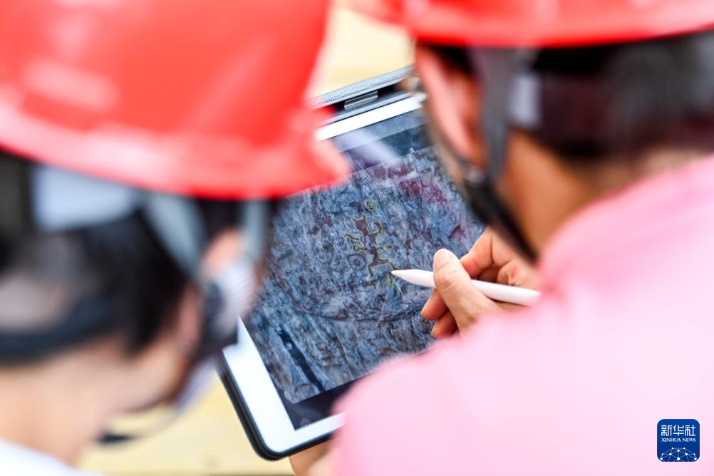 6月19日,在位于广西宁明县的一处花山岩画,工作人员对数字岩画进行补全。