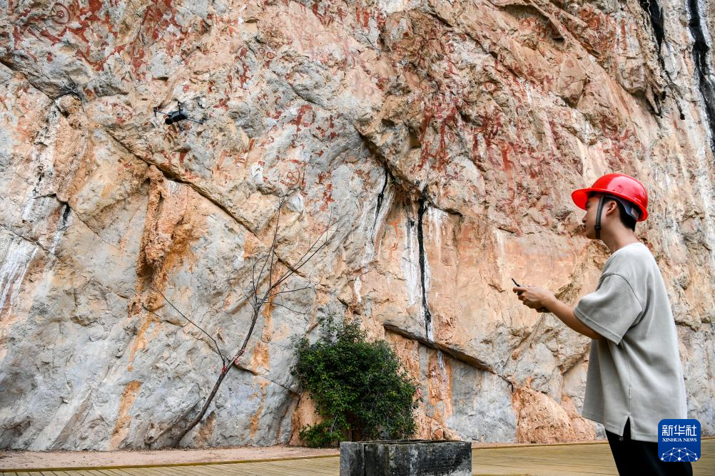 6月19日,在位于广西宁明县的一处花山岩画,工作人员使用无人机对岩壁进行拍照。