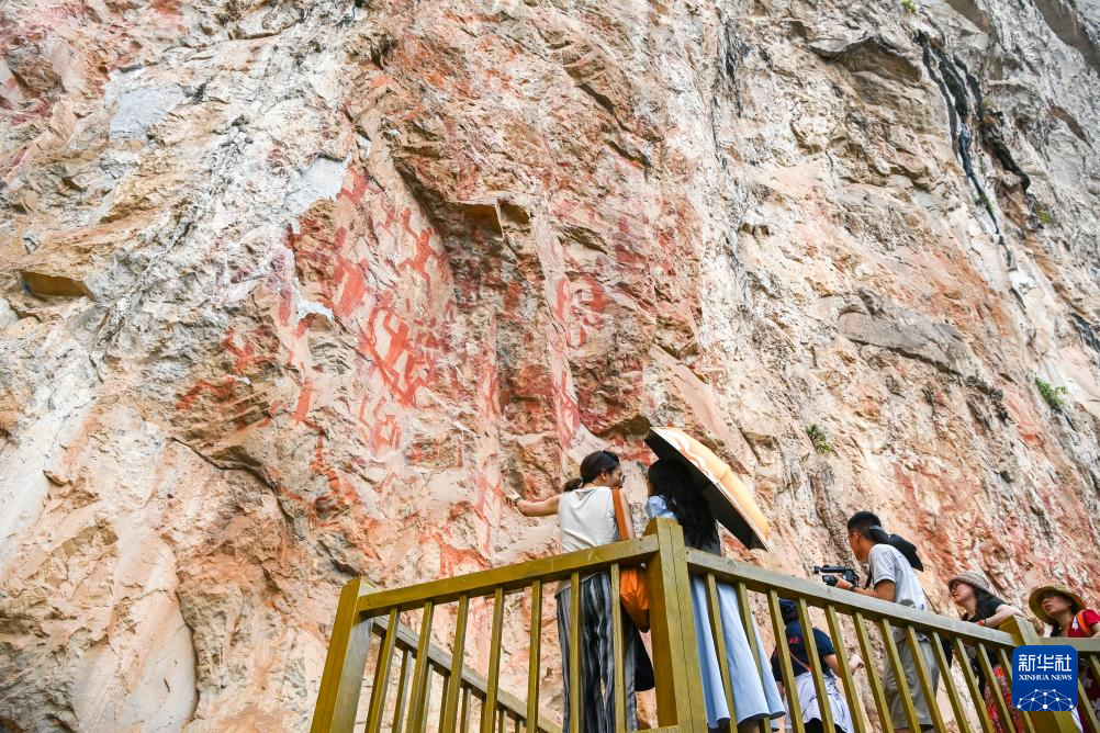 6月18日,游客在位于广西宁明县的一处花山岩画游览参观。