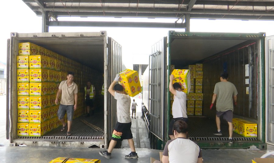 通过海关查验后,东盟新鲜水果进入中国市场流通的“第一站”——中国—东盟(崇左)水果交易中心。在货物过驳平台上,工人们将火龙果从货车卸下,转运至国内运输车辆,发往各地。作为广西三大水果交易中心之一,该中心核心区已建成投入使用,具备产品集散、线上线下交易等五大功能,日均交易量大且快速提升。