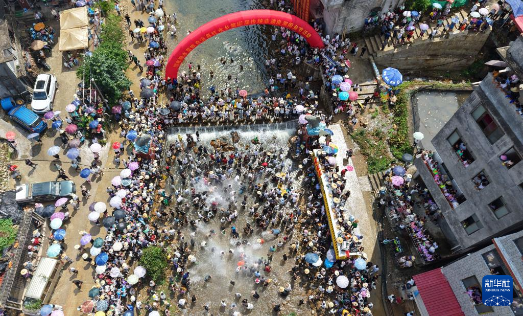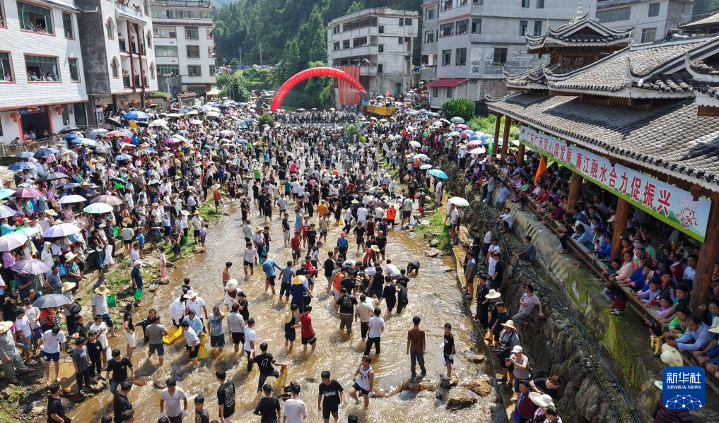 7月10日,在融水苗族自治县红水乡良双村闹鱼节活动中,村民和游客在河里抓鱼(无人机照片)。当地利用粤桂协作资金,不断提升闹鱼节活动基础设施条件,增强游客和村民的体验感。