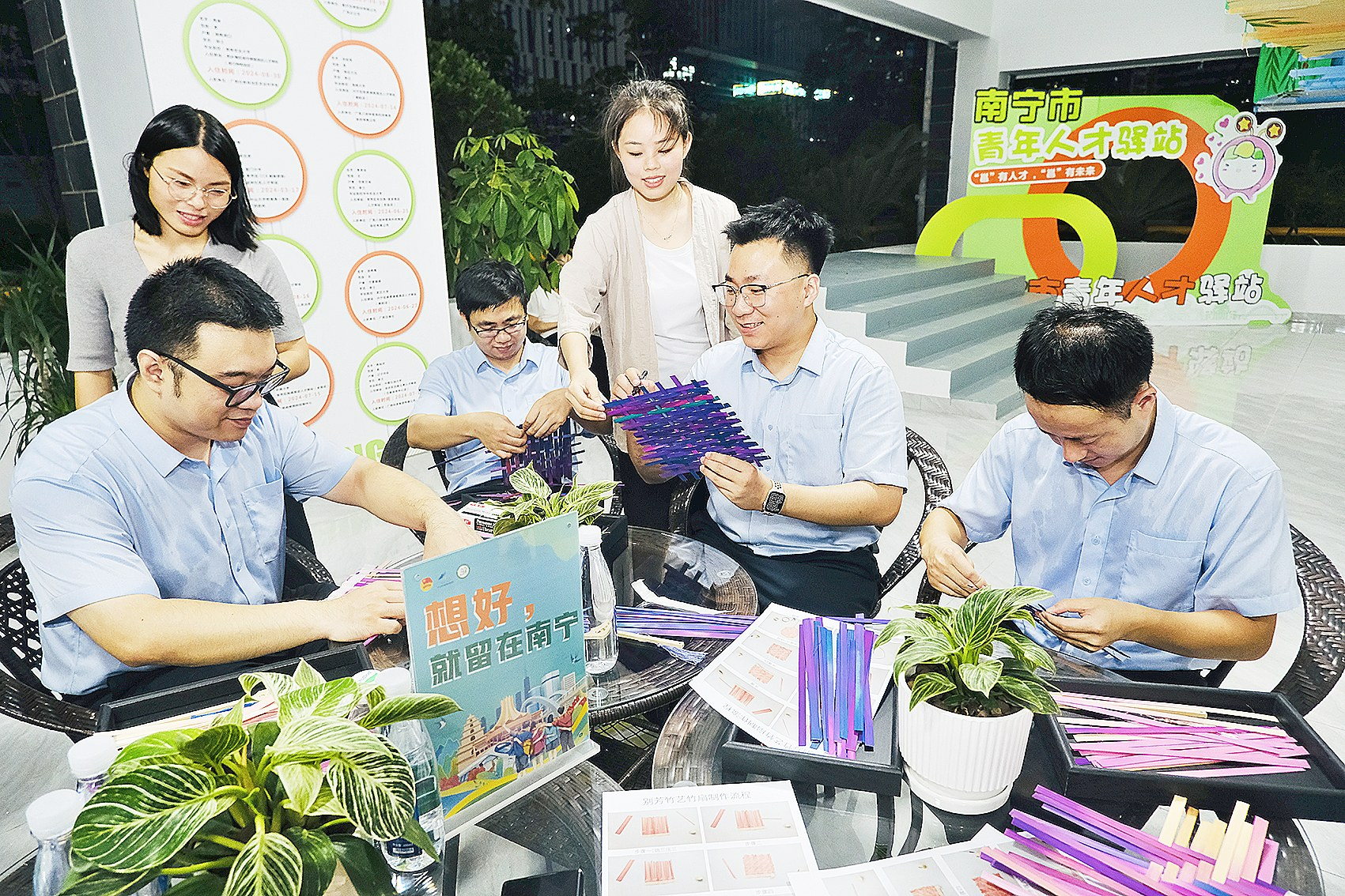 南宁初芯集成电路设计有限公司职工冯冠军曾是驿站的住客之一。他感慨道:“免费入住政策帮我节省了求职过渡期的开支,更珍贵的是,我在这里结交了新朋友。”这份萍水相逢的温暖,成为他最终决心扎根南宁的动力。广西农业职业技术大学学生杨娟近日重返驿站,参加在驿站举办的非遗竹编体验活动。她由衷赞叹,驿站不仅减轻了她的经济压力,还拓宽了青春视野与人际纽带。