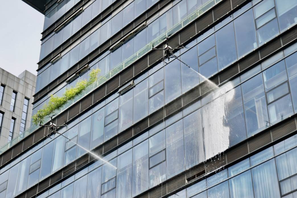 原标题:无人机清洗玻璃幕墙效率有多高? 1小时完成“蜘蛛人”2日工作量