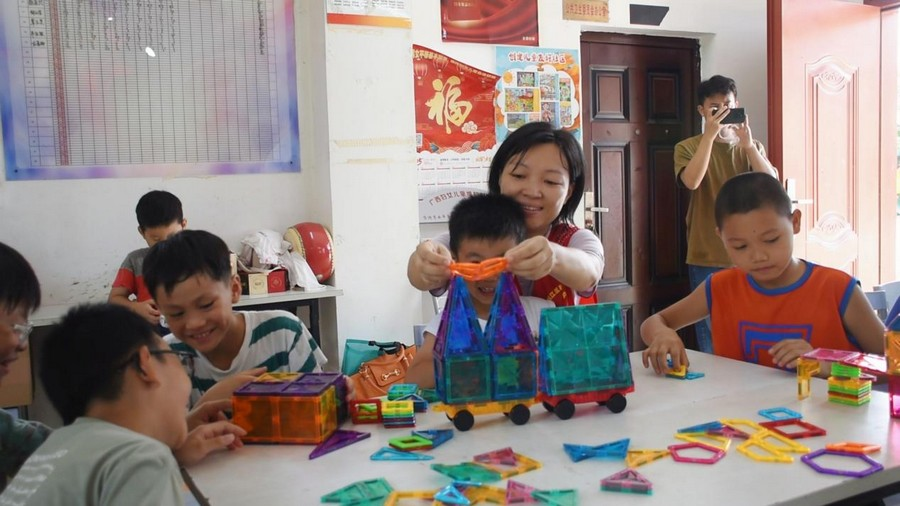 在五圩镇板銮村,孩子们在驻村工作队及“爱心妈妈”志愿者的带领下参与篮球比赛、跳长绳活动。活动还设置了剪纸、画画、搭积木、读绘本、防溺水知识宣讲等环节。