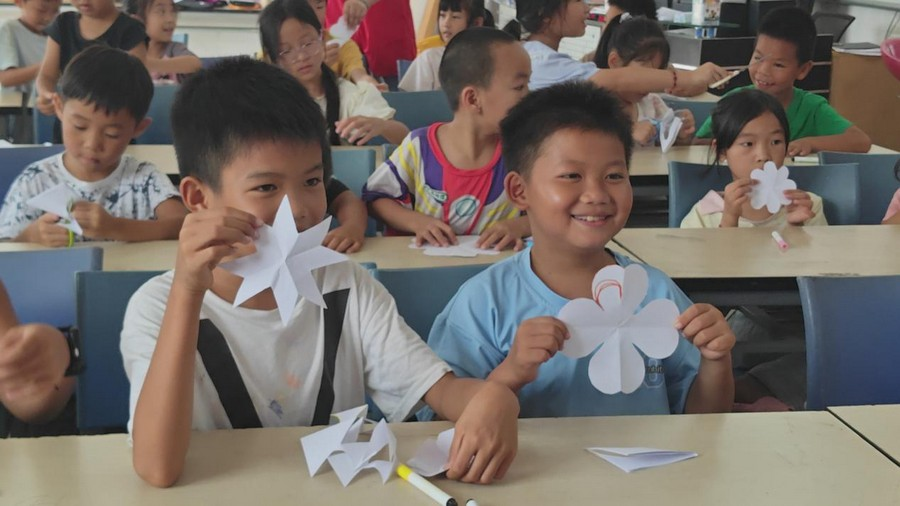 孩子们展示剪纸作品。