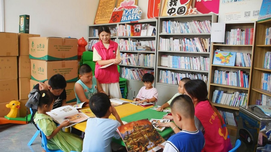 河池市金城江区五圩镇板銮村,爱心妈妈带领孩子们一起阅读绘本。