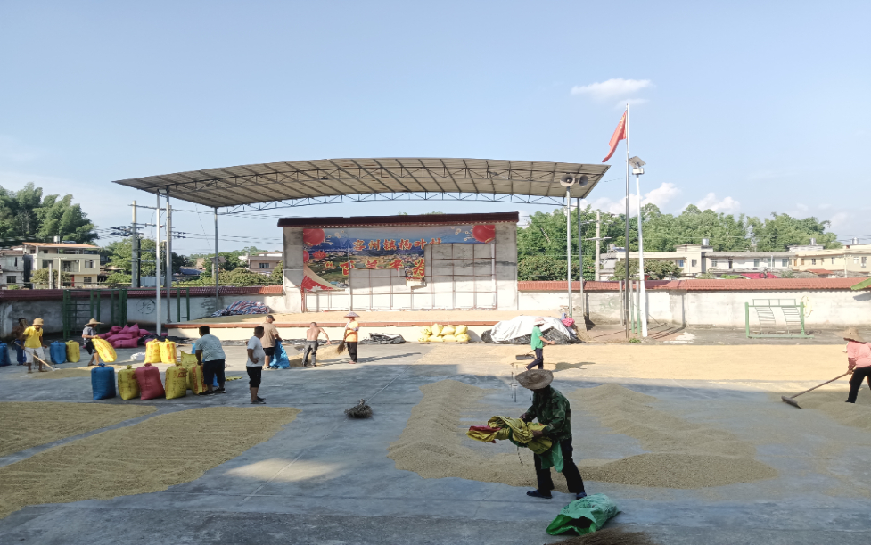 今年早稻收割以来,容县各村聚焦“晒粮难”“卖粮远”问题,整合村委会广场、文化活动中心等公共空间,设置多个“共享晒粮点”,满足众多农户晾晒需求。“往年早稻收割后最愁晒粮,家里场地不够,路边晒又怕雨淋,现在村里把广场提供给大家晾晒稻谷,水泥地平整宽敞,还有村干部帮忙看管,收购商直接来这里收粮,晒好就能卖,省时又省力!”正在翻晒稻谷的容州镇杨叶村甘大叔说。