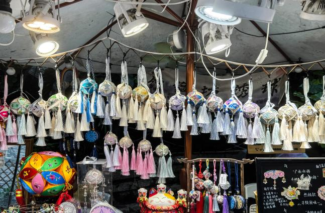 广西非遗壮乡绣球和壮锦手工艺品的店铺前,众多游客驻足。市民王女士说:“晚上带孩子来‘三街两巷’吃饭、逛街,还能观赏和体验非遗文化,很有意义。