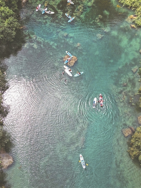 龙州天琴壮寨坐拥“龙州古八景”之一的古甑龙泉,湖水空明澄碧,是泛舟戏水的好去处。今年暑期,景区精心打造自然亲水空间,创新桨板玩法,为游客提供独特的玩水体验。