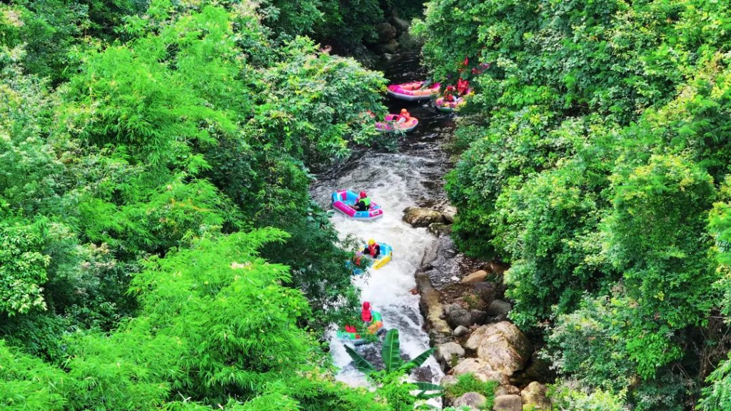 金秀瑶族自治县,位于大瑶山腹地,全县森林覆盖率超82%,负氧离子含量高,年平均气温17℃,夏季平均气温21℃,拥有圣堂山、圣堂湖、银杉森林公园、大瑶山盘王界景区等丰富的旅游资源,被誉为“岭南避暑胜地”。在这里,游客们可以避暑漂流、徒步探险、体验民宿,享受优美的自然风光。