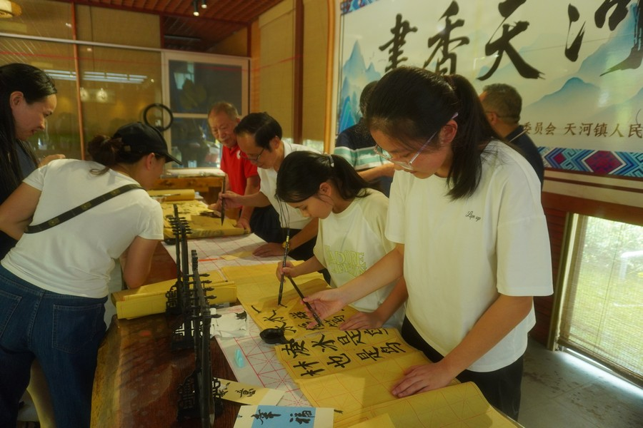 在北华村旅居点分会场,当地用本地特产珍珠糯玉米熬制粥品,免费邀请游客和乡亲品尝。翠竹阁的文化传承专场中,天河籍书法家们现场挥毫泼墨,指导小朋友和游客提笔习字,传递“丰收”“振兴”“团结”等理念。“榜山题名”打卡墙前人潮涌动,游客纷纷留名寄愿。读书角内,大人孩子静心阅读。