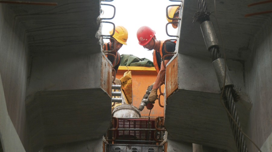 近日,柳梧铁路4标项目金田紫荆河特大桥段现场机器轰鸣,工人们正在紧张有序地进行最后一片T梁的架设工作。随着最后一片32米T梁落位,柳梧铁路4标项目T梁架设任务完成,为后续桥面附属、桥面防水施工奠定了坚实基础。