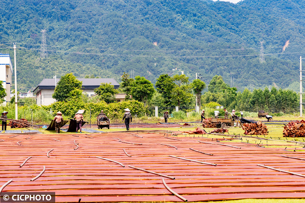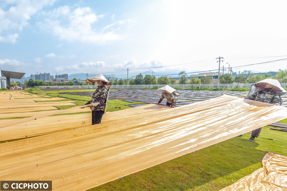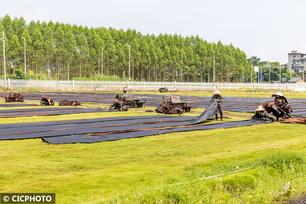 ↑2025年7月30日,在广西梧州市蒙山县一家丝绸企业的晒坪内,工人在收集晒干的香云纱。CICPHOTO/黄胜林 摄