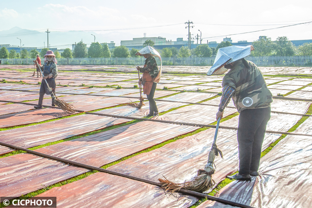 ↑2025年7月30日,在广西梧州市蒙山县一家丝绸企业的晒坪内,工人在清理晾晒的香云纱上的积液。CICPHOTO/黄胜林 摄