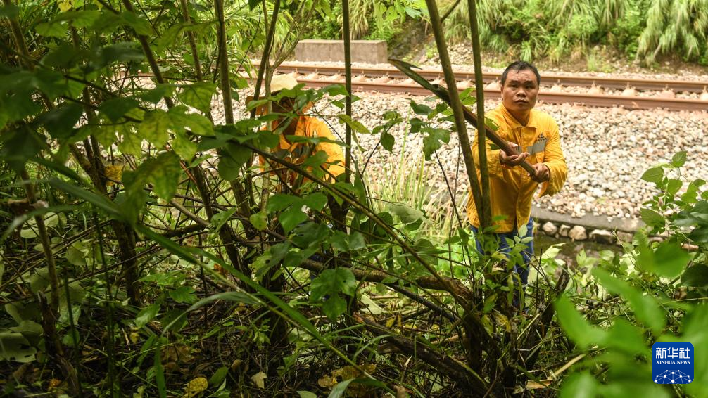 这是钦州电务段铁路通信工在砍伐可能影响铁路运输的杂木(8月6日摄)。