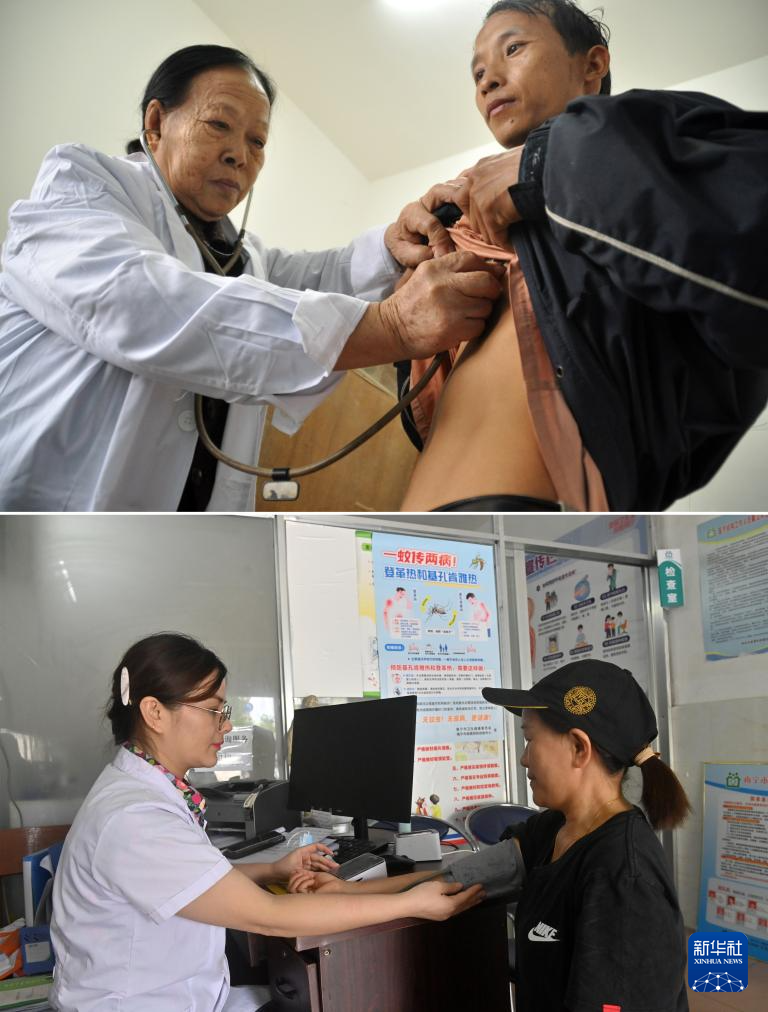 这是一张拼版照片。上图:杜桂梅医生(左)在高岭村卫生室为村民检查身体(2011年12月7日摄)。下图:潘雪梅医生(左)在高岭村卫生室给村民测量血压(2025年8月18日摄)。
