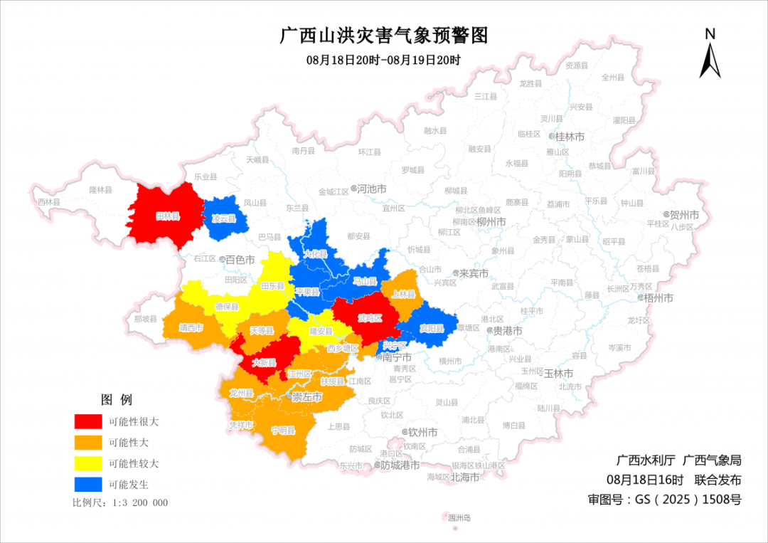 8月18日下午4时,自治区水利厅和自治区气象局联合发布山洪灾害气象预警:预计,8月18日晚上8时至19日晚上8时,南宁市中部、百色市西北部、崇左市北部发生山洪灾害可能性很大(红色预警),河池市南部可能发生山洪灾害(蓝色预警)。
