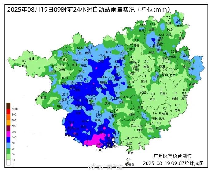 8月18日9时至19日9时,广西有6个设区市的15个县(区)出现大暴雨,有9个设区市的40个县(区)出现暴雨,有12个设区市的74个县(区)出现大雨,最大为防城港防城区扶隆镇193.1毫米。
