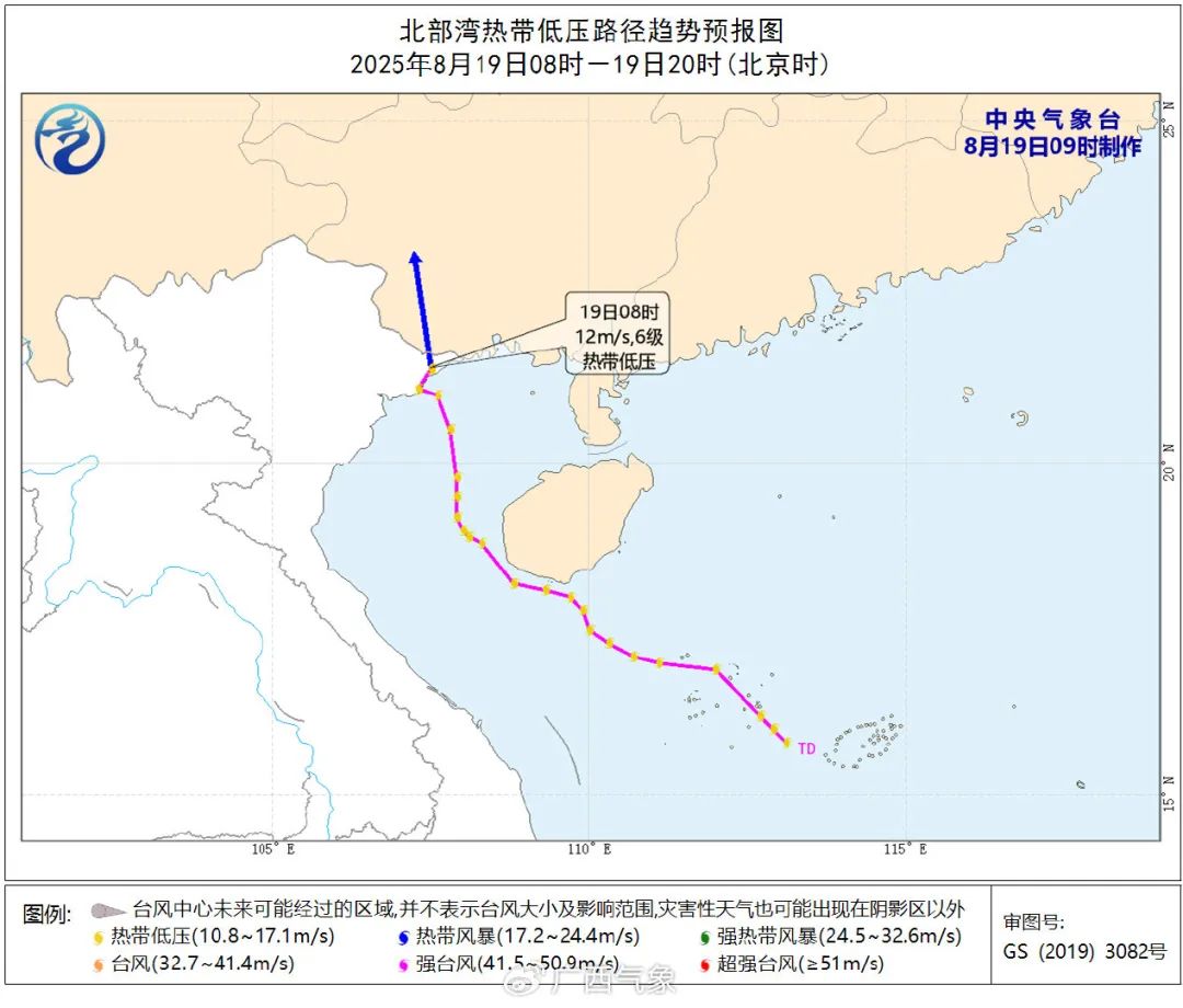 广西气象台19日12时发布预报:台风暴雨双预警继续生效,强降雨集中桂北及沿海。