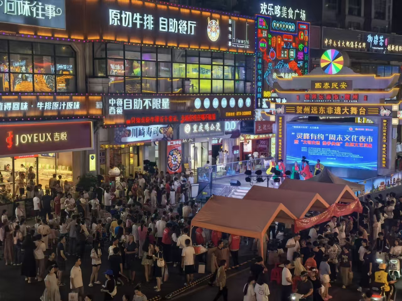 傍晚时分,暑气逐渐散去,市民们聚在商圈里的舞台前,不多时,一场文艺演出拉开了序幕。由文艺爱好者带来《京腔戏韵》表演,“常青艺术团”呈现国潮戏曲《梨园春》,八步龙山小学学生表演原创作品《圆梦蒲公英》……这是每周末晚,在贺州市城区远东商圈内举行“灵峰有约”周末文化夜市活动的一个缩影。