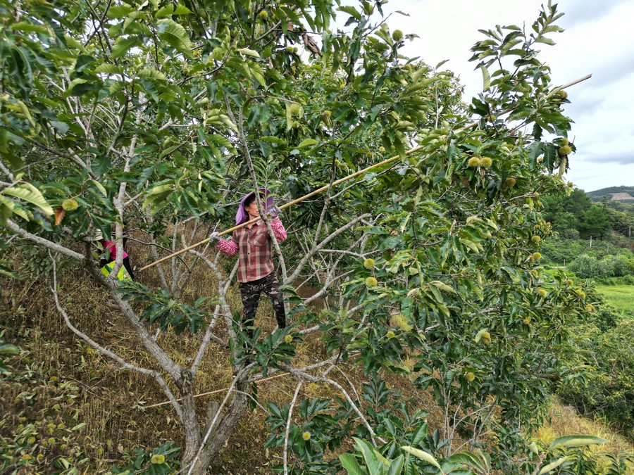 村民正在用竹竿打板栗。莫斌 摄