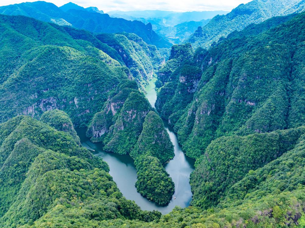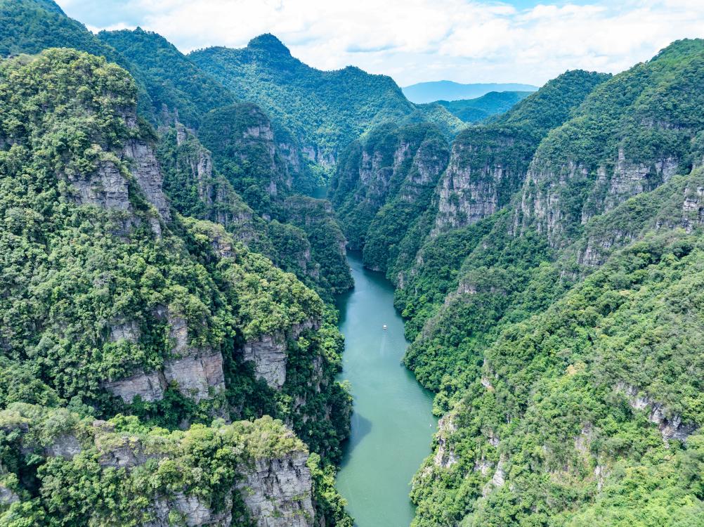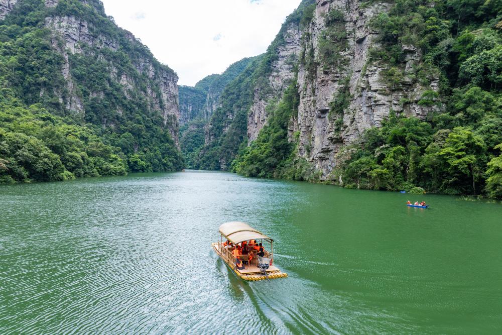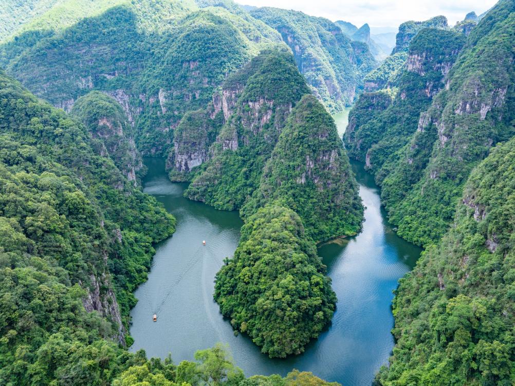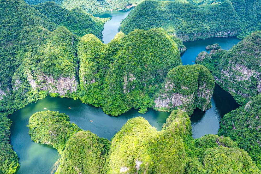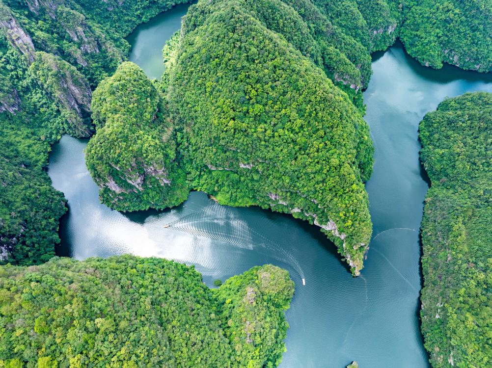 ↑2025年8月24日,广西来宾市金秀瑶族自治县长垌乡,游客乘船在圣堂湖观光游览。(无人机照片)CICPHOTO/黄胜林 摄