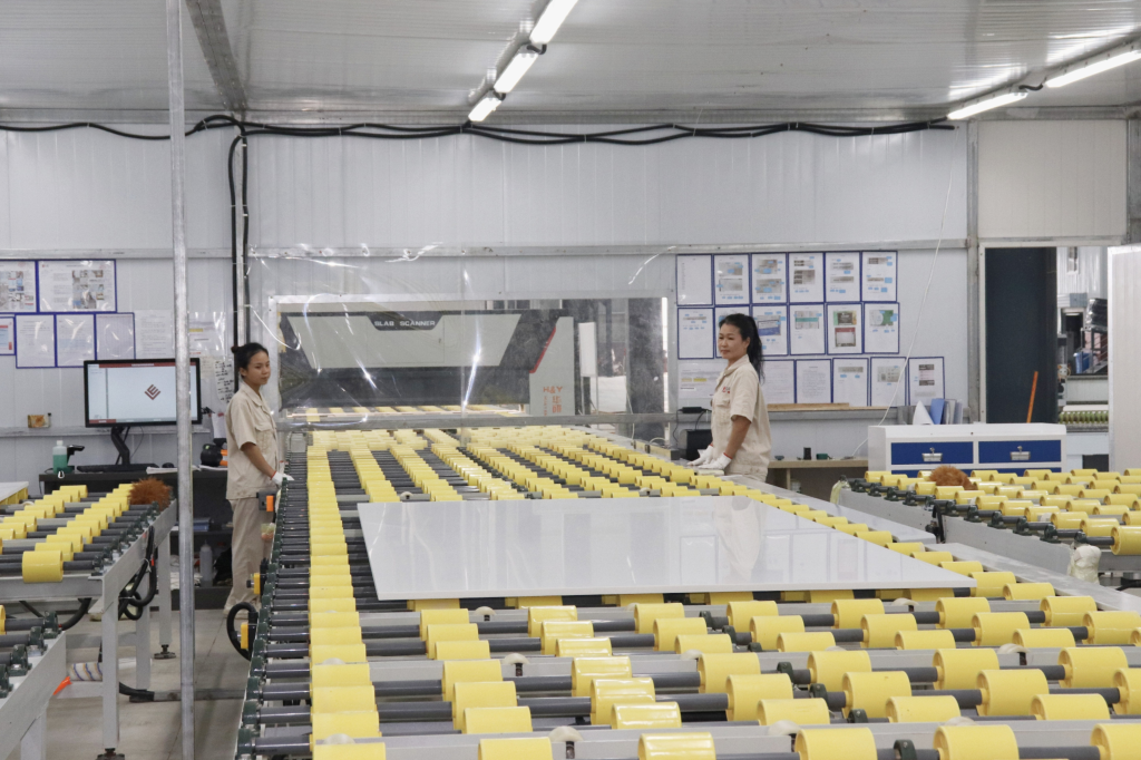 走进仁新非金属新材料(广西)有限公司的生产车间,自动化流水线有序运转:石英石经清洗、破碎、磁选、色选、筛分等多道工序制成砂与粉,按比例搅拌、机压、固化后,再经磨抛成为光滑板材。