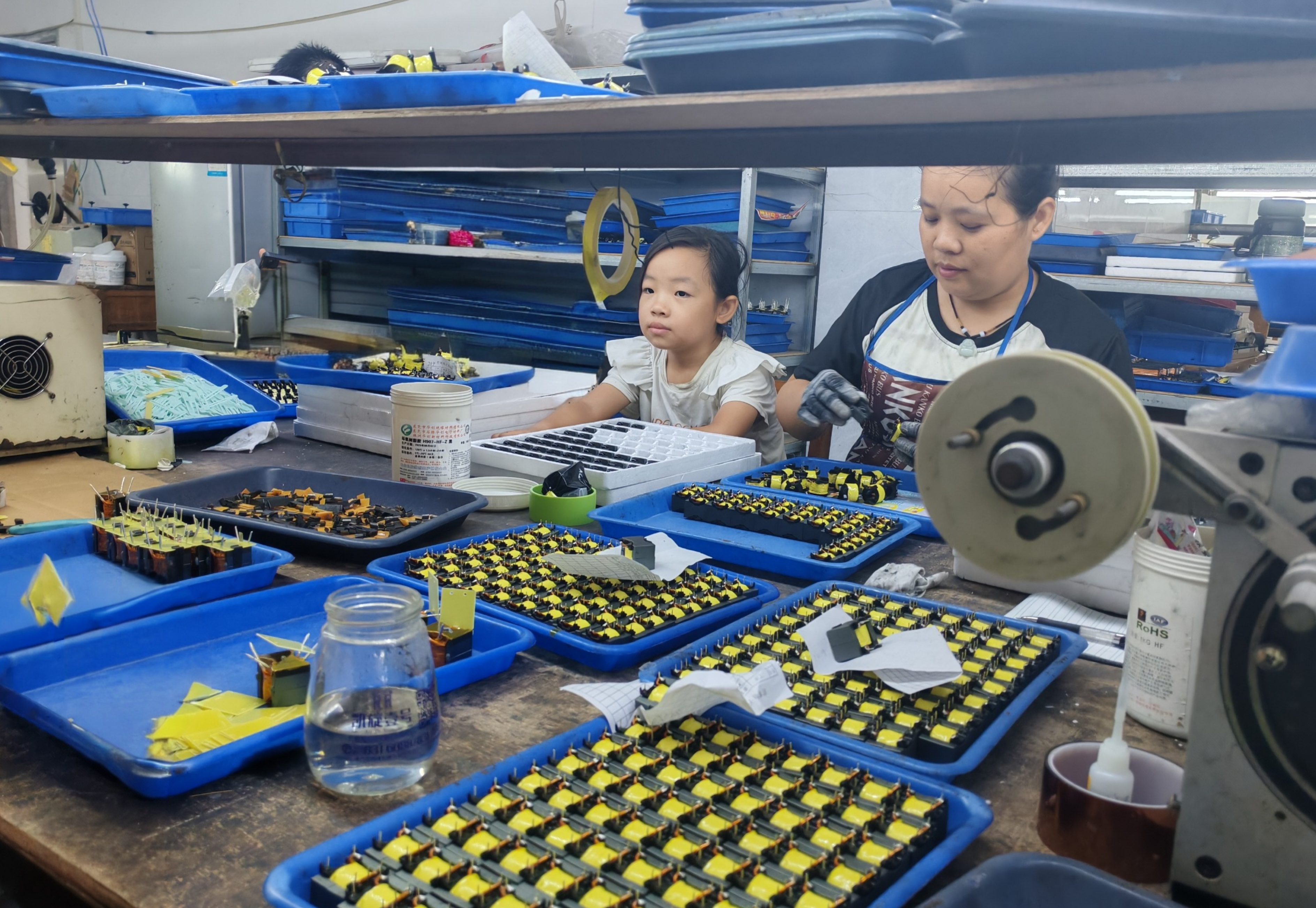 径口镇鼎和电子公司村民组装电子零件。