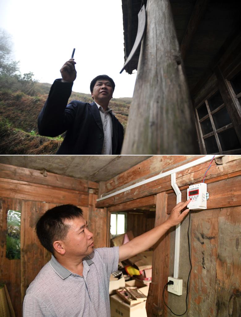 这是一张拼版照片,上图:在广西龙胜各族自治县龙脊镇江柳村翁江小学,余启贵老师敲击一块钢板催促学生进教室上课(2013年2月26日摄);下图:在广西龙胜各族自治县龙脊镇江柳村翁江小学,余启贵老师在检查微电脑全自动打铃仪的运行情况(2020年7月7日摄)。