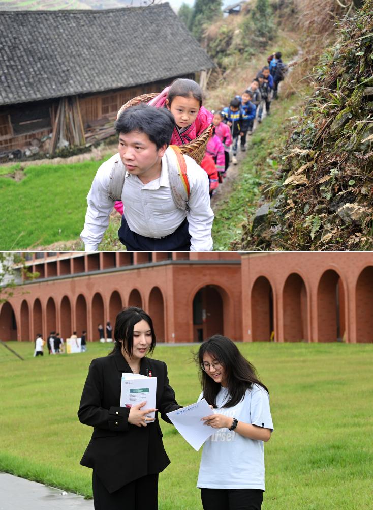 拼版照片。上图:在广西龙胜各族自治县龙脊镇江柳村,余启贵老师用背篓背着学生余茂鲜走在放学回家的路上(2013年2月26日摄)。下图:在桂林信息科技学院,余茂鲜(右)向辅导员朱婷婷请教有关学习的问题(2025年5月29日摄)。
