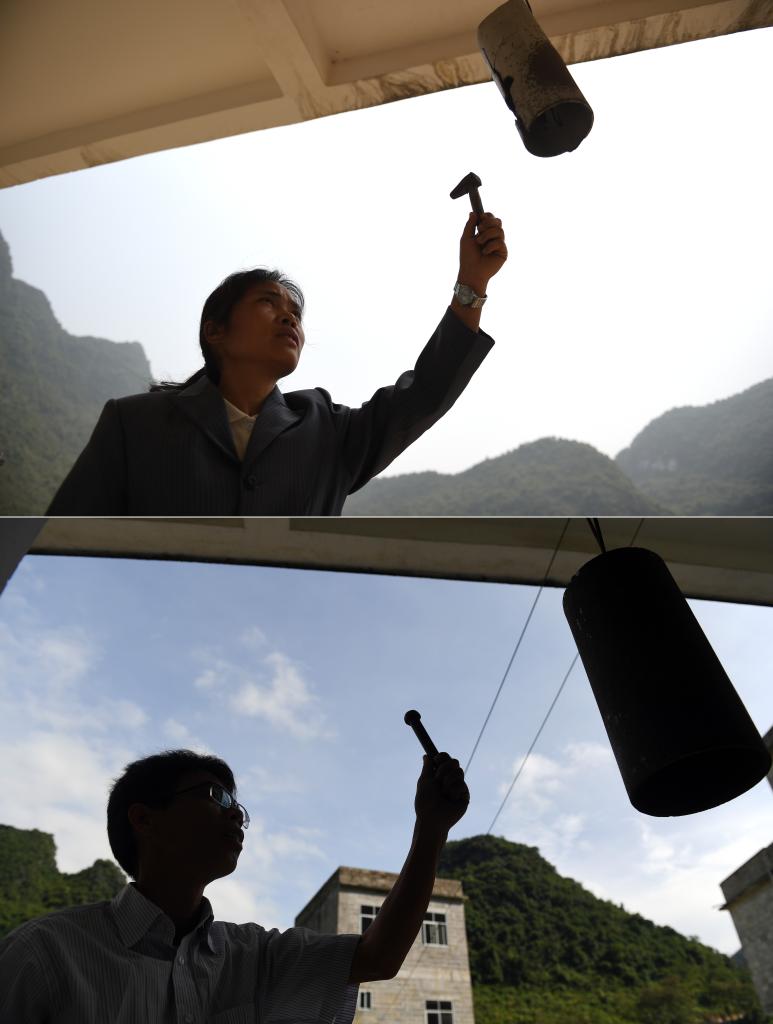 拼版照片:上图为在广西天等县进远乡进远村龙坚教学点,梁碧莹老师在敲“钟”准备上课(2016年4月14日摄);下图为在广西天等县进远乡进远村龙含教学点,农志鹏老师在敲“钟”准备上课(2017年9月7日摄)。