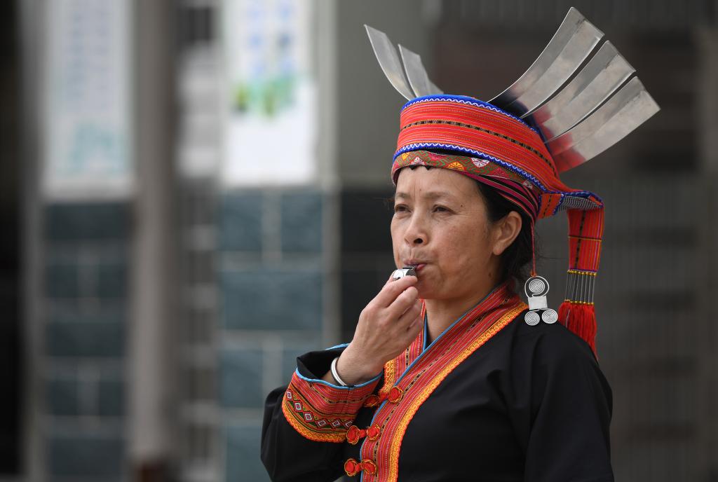 在广西金秀瑶族自治县忠良乡山界教学点,陶凤英老师在吹哨子催促学生进教室上课(2019年6月4日摄)。