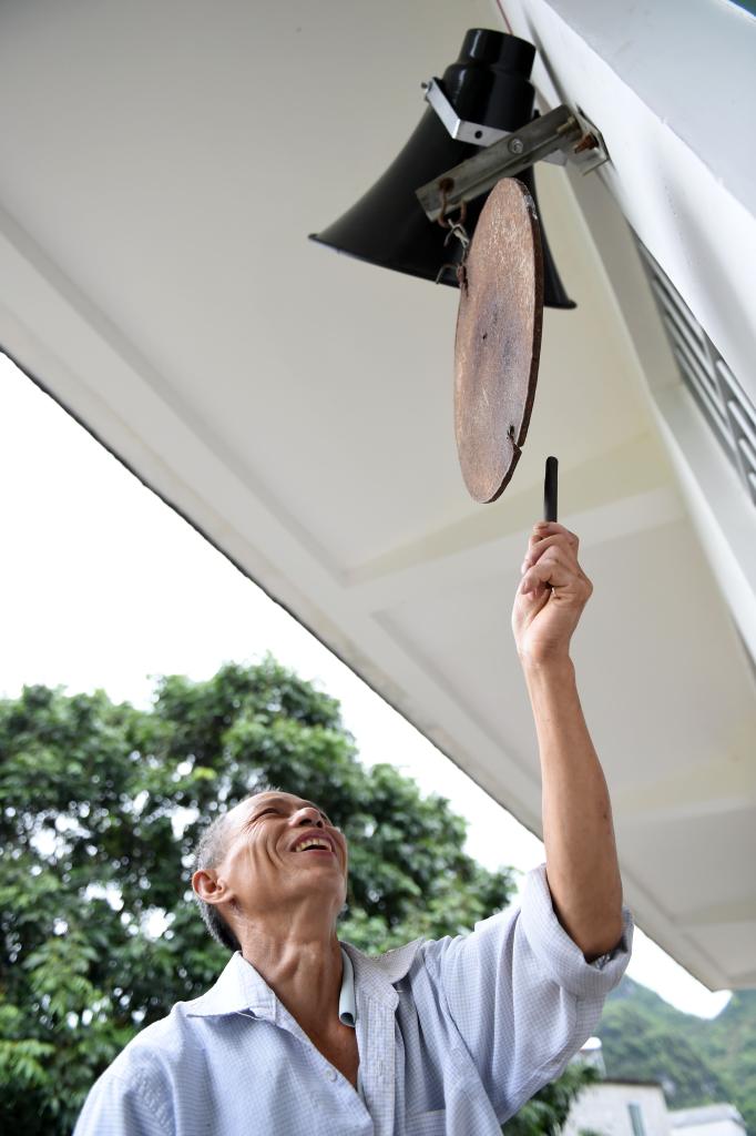 在广西融水苗族自治县汪洞乡新合村达佑教学点,周宏军老师在敲“钟”准备上课(2019年5月28日摄)。