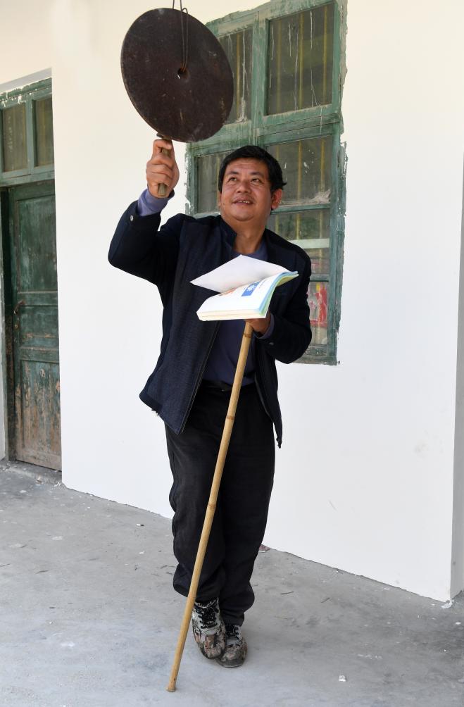 在广西环江毛南族自治县龙岩乡朝阁小学,刘显岳老师在敲上课“钟”(2019年12月4日摄)。