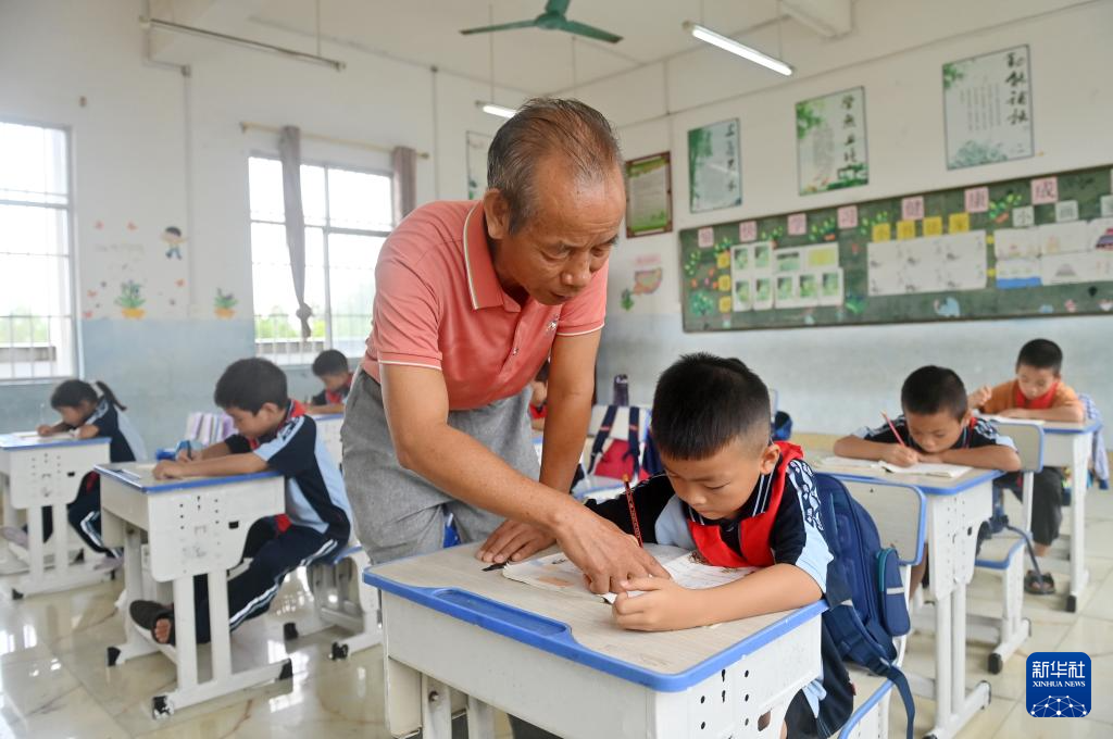 9月9日,在广西宾阳县王灵镇中心学校七新教学点,王英红老师在课间辅导学生功课。