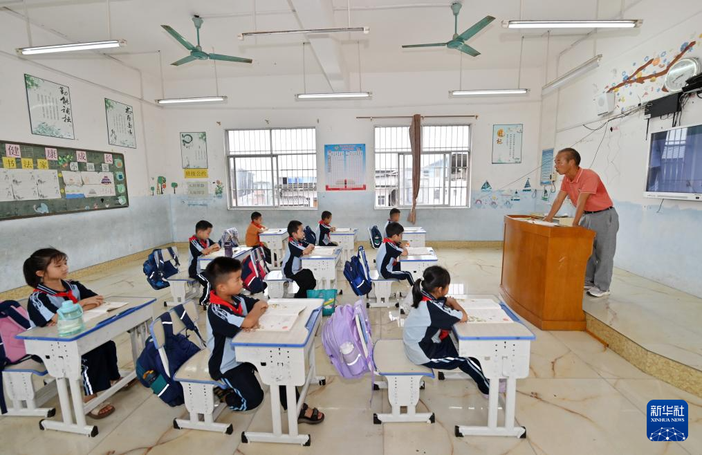 9月9日,在广西宾阳县王灵镇中心学校七新教学点,王英红老师在给学生上课。