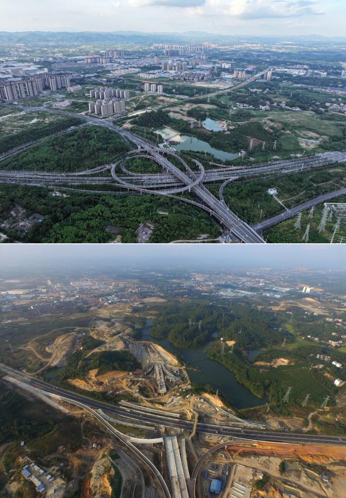拼版照片:上图为广西南宁东站附近的北凤立交桥(无人机照片,2025年9月6日摄),下图为正在建设中的南宁市北凤立交桥(无人机照片,2015年8月15日摄)。
