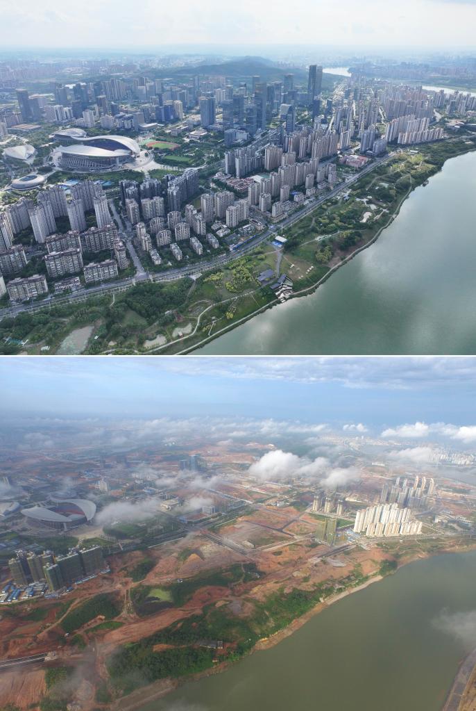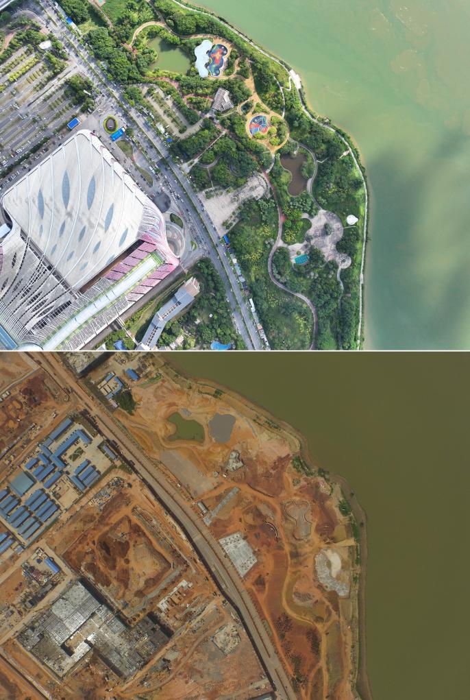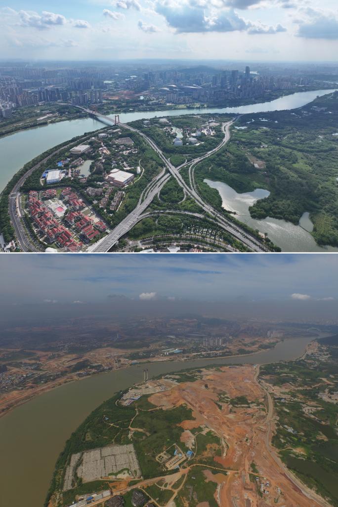 拼版照片:这是广西南宁市五象新区一处沿江公园建成前后对比图(无人机照片,上图为2025年9月6日摄,下图为2015年8月13日摄)。