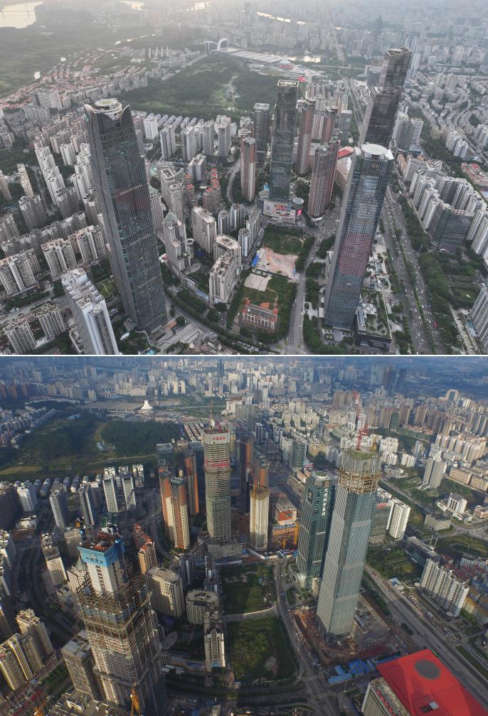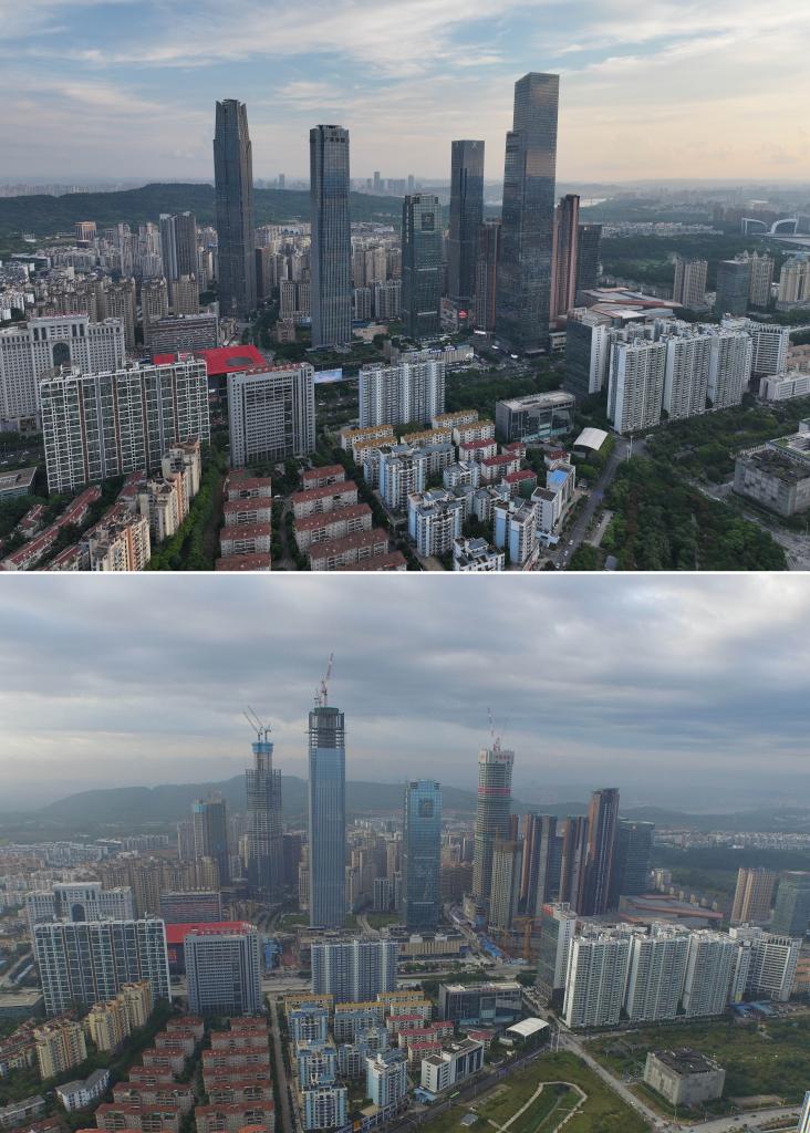 拼版照片:上图为南宁市区埌东片区的几栋摩天大楼(无人机照片,2025年9月14日摄),下图为南宁市区埌东片区在建的几栋摩天大楼(无人机照片,2015年11月21日摄)。