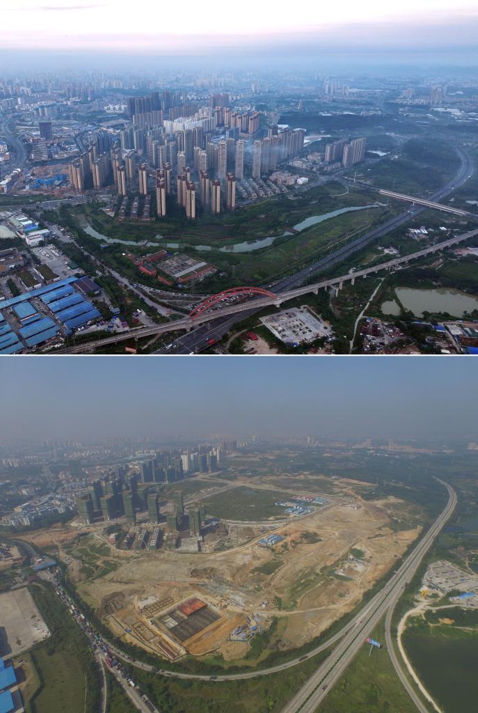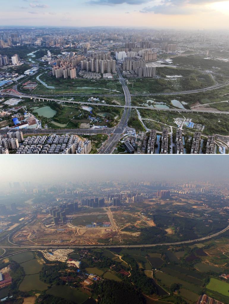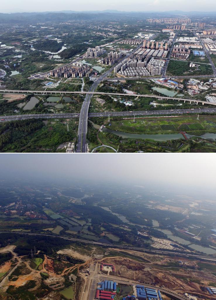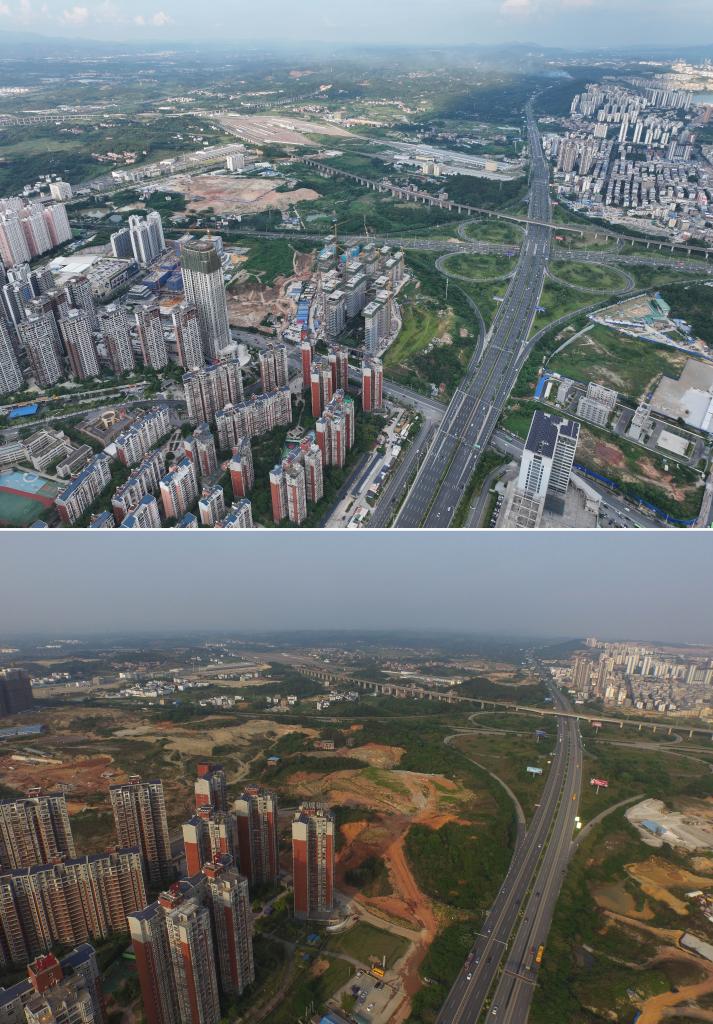 拼版照片:上图为广西南宁市那安快速路两侧的建筑及景观(无人机照片,2025年9月6日摄),下图为广西南宁市绕城高速公路(现为那安快速路)两侧的建筑及景观(无人机照片,2015年8月10日摄)。