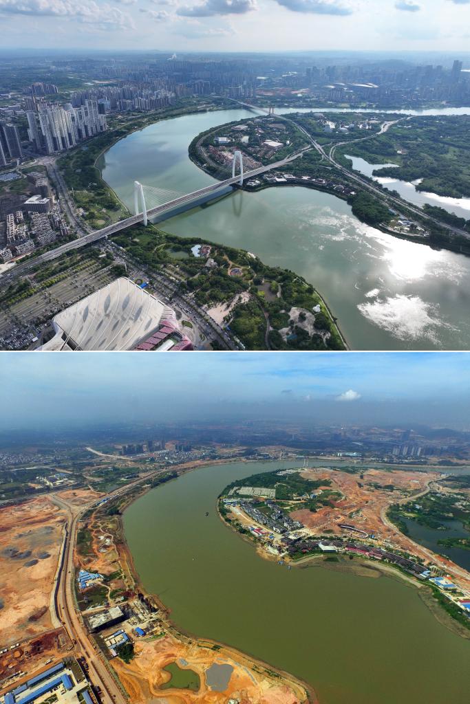 拼版照片:上图为广西南宁市那考河湿地公园及周边住宅楼(2025年9月16日摄,无人机照片),下图为刚刚开工建设的那考河治理项目(2015年10月15日摄,无人机照片)。