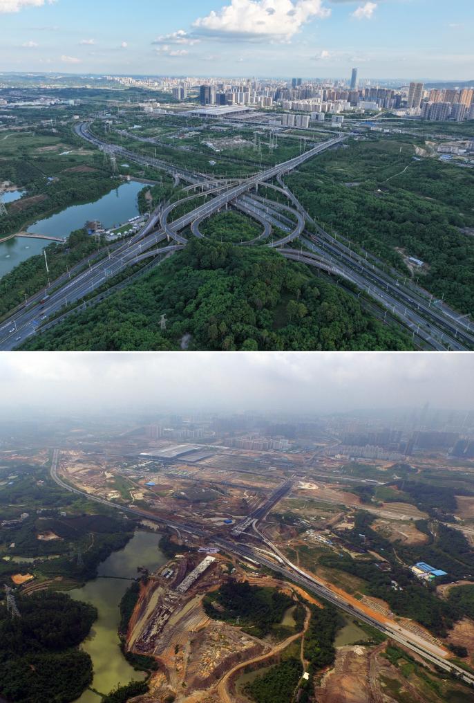 拼版照片:上图为广西南宁东站附近的北凤立交桥(无人机照片,2025年9月6日摄);下图为正在建设中的南宁市北凤立交桥(无人机照片,2015年8月15日摄)。