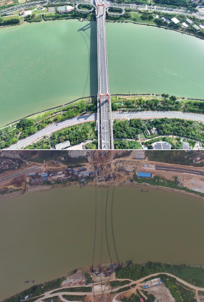 拼版照片:这是广西南宁市良庆大桥建成前后对比图(无人机照片,上图为2025年9月6日摄,下图为2015年8月13日摄)。