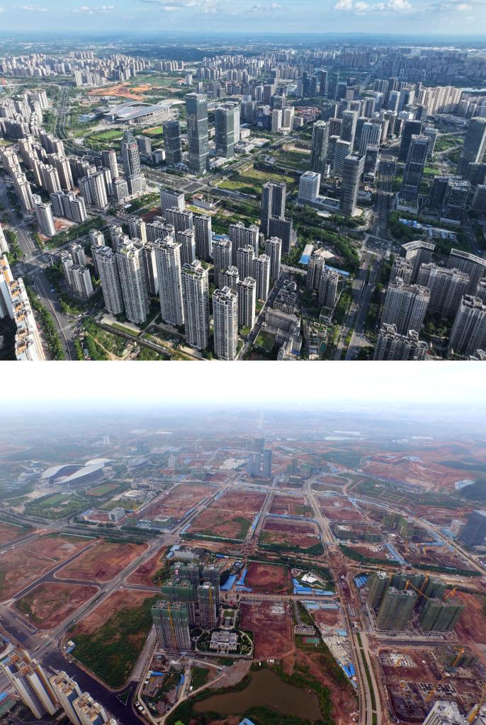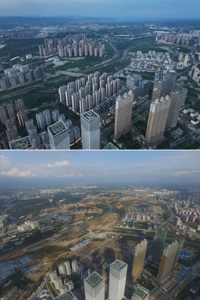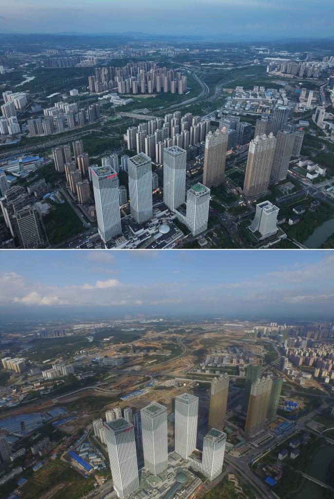 拼版照片:广西南宁市五象新区十年前后对比图(无人机照片,上图为2025年9月6日摄,下图为2015年8月16日摄)。