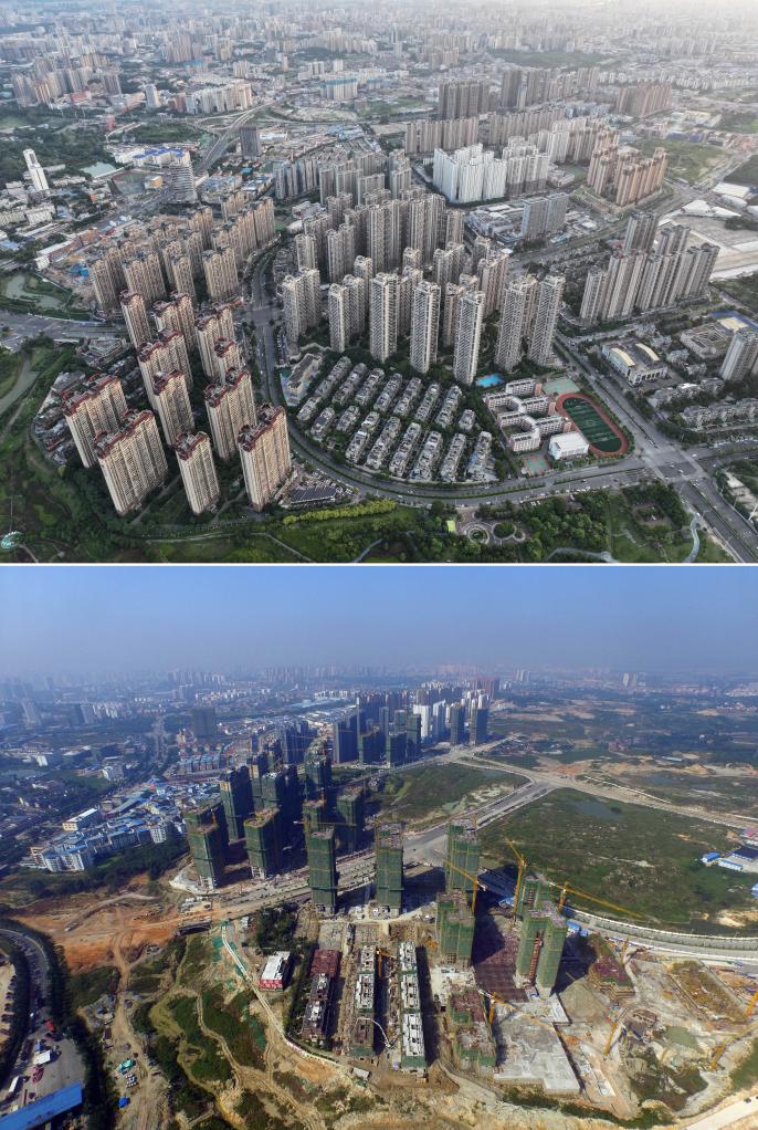 拼版照片:上图为广西南宁市那安快速路附近的一处住宅区(无人机照片,2025年9月6日摄),下图为广西南宁市绕城高速公路(现为那安快速路)附近的一处住宅区(无人机照片,2015年10月15日摄)。
