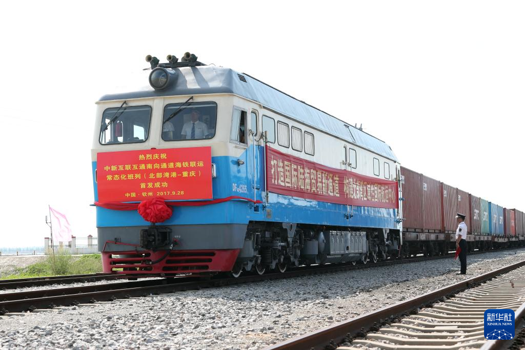 这是中新互联互通南向通道铁海联运常态化班列(北部湾—重庆)在钦州港东站首发(2017年9月28日摄)。