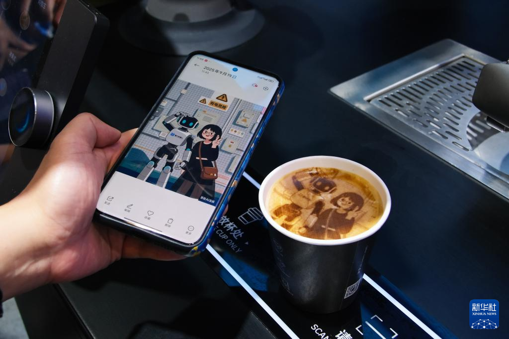 9月19日,在南宁国际会展中心,参观者展示一款由咖啡机器人制作的咖啡拉花。
